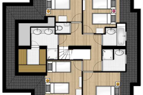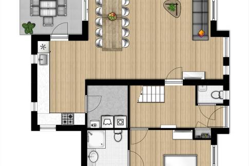 Via de openslaande tuindeuren kom je op het gemeubileerde terras. Boven zijn 4 slaapkamers en 3 badkamers met een douche, waarvan 1 met een traditionele sauna en 1 met een toilet. Ook is er een apart toilet. Je kunt gratis gebruikmaken van wifi.