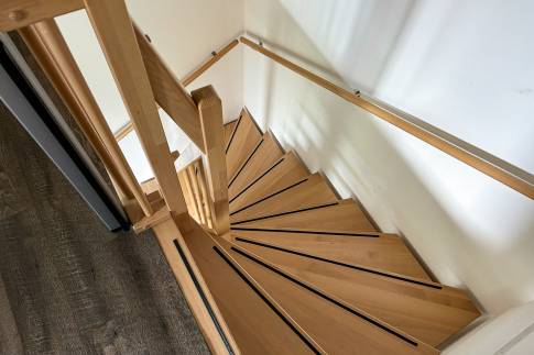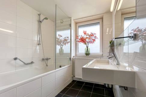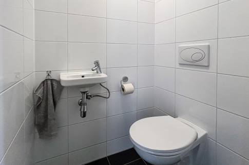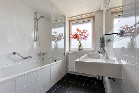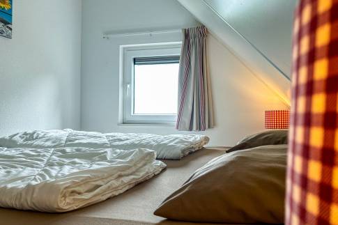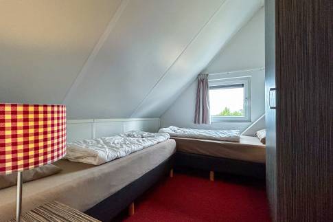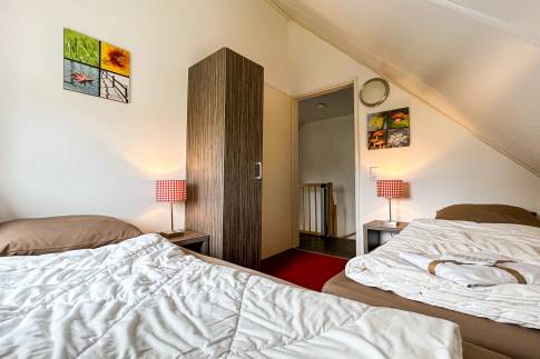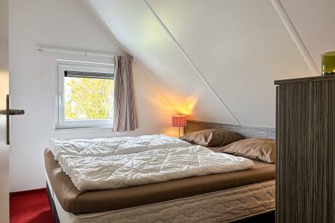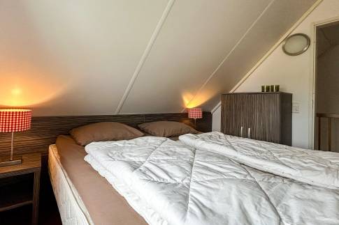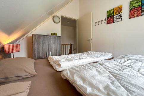 Op de bovenverdieping bevinden zich twee slaapkamers. De slaapkamers zijn elk voorzien van boxspringbedden. In een van de slaapkamers ligt er een softtopper op de bedden. De ruime badkamer heeft een ligbad/douche combinatie, thermostaatkranen en dubbele wastafel. In de woning zijn diverse kindervoorzieningen aanwezig, waaronder een houten ledikant, kinderstoel en traphekje.