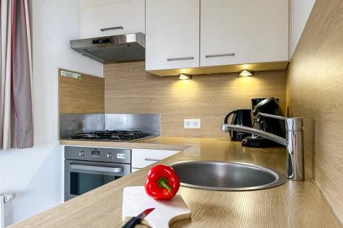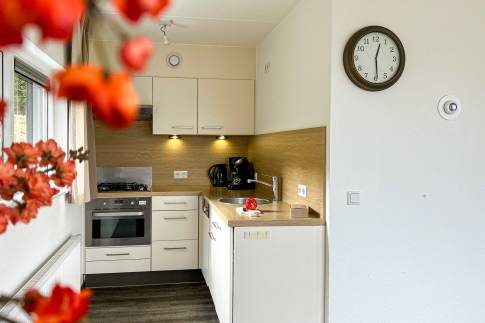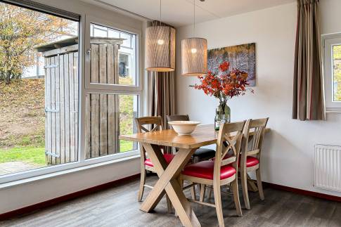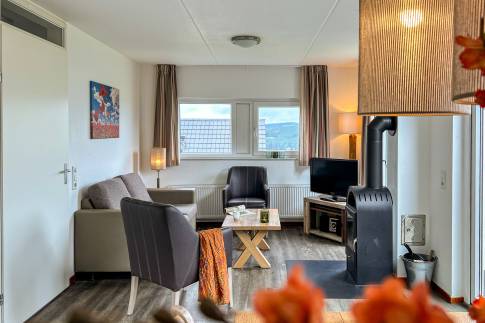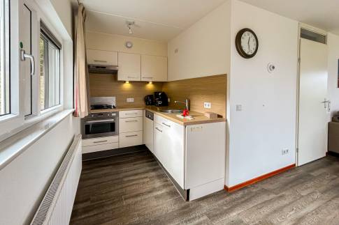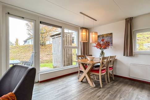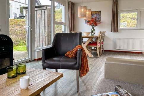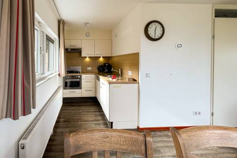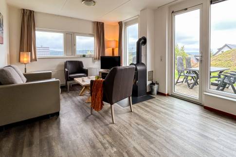 Deze woning is geschikt voor 4 personen (type 4U). De woonkamer heeft een comfortabele zithoek, eethoek en een open keuken. De open keuken is voorzien van diverse inbouwapparatuur zoals vaatwasser, magnetron en zowel een filter- als een Senseo koffiezetapparaat. Het terras van de woning heeft comfortabel terrasmeubilair. Het separaat toilet is ook beneden.