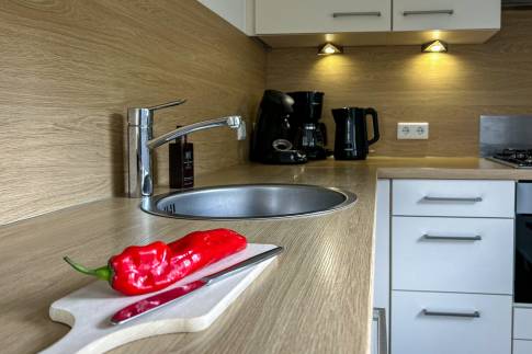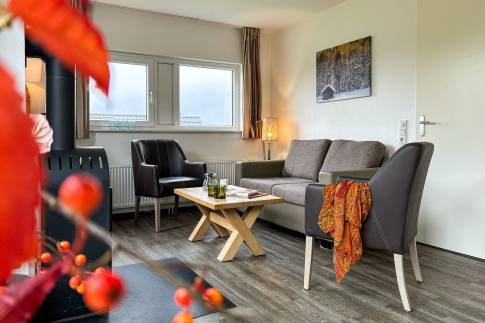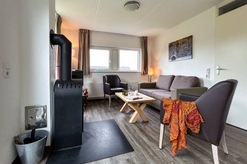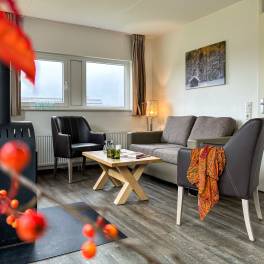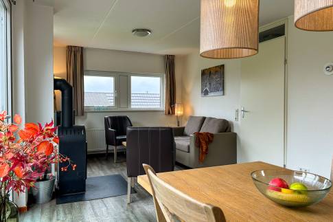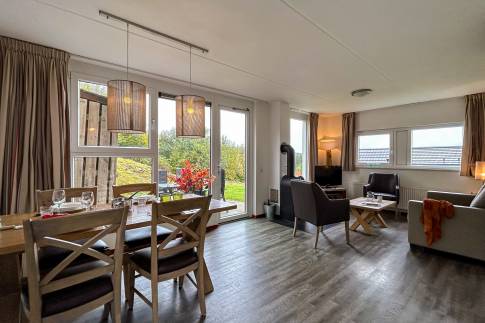 Deze woning is geschikt voor 4 personen (type 4U). De woonkamer heeft een comfortabele zithoek, eethoek en een open keuken. De open keuken is voorzien van diverse inbouwapparatuur zoals vaatwasser, magnetron en zowel een filter- als een Senseo koffiezetapparaat. Het terras van de woning heeft comfortabel terrasmeubilair. Het separaat toilet is ook beneden.