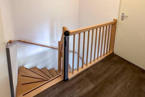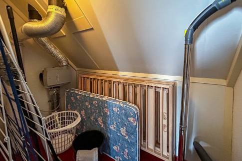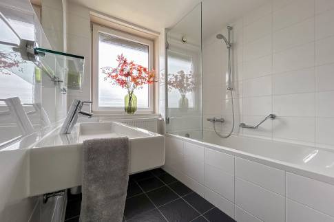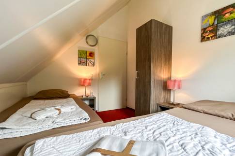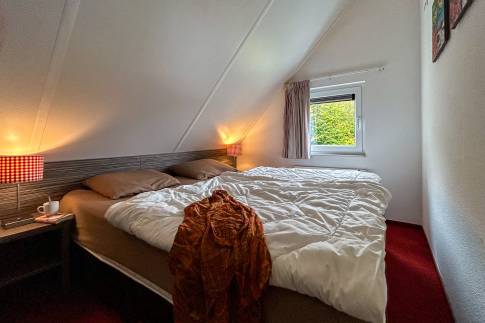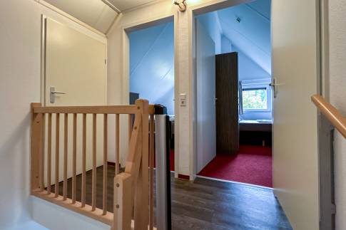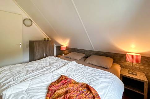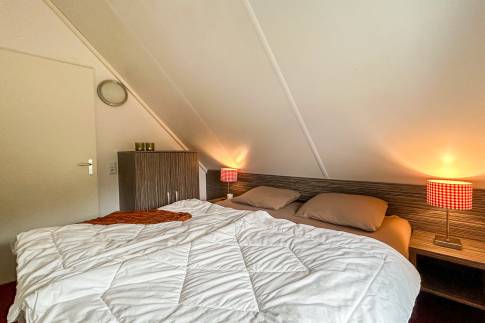 Op de bovenverdieping bevinden zich twee slaapkamers. De slaapkamers zijn elk voorzien van boxspringbedden. In een van de slaapkamers ligt er een softtopper op de bedden. De ruime badkamer heeft een ligbad/douche combinatie, thermostaatkranen en dubbele wastafel. In de woning zijn diverse kindervoorzieningen aanwezig, waaronder een houten ledikant, kinderstoel en traphekje.