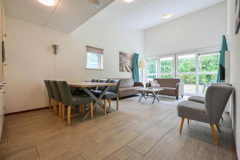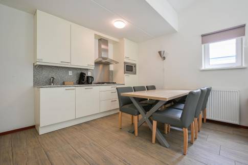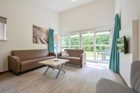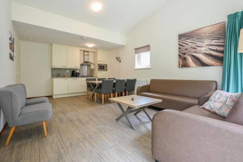 De lichte woonkamer is voorzien van een comfortabele zithoek en een smart-tv. De open keuken beschikt over diverse inbouwapparatuur, waaronder een vaatwasser, magnetron, koelkast, koffiepadapparaat en waterkoker – alles voor een zorgeloos verblijf.