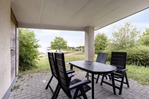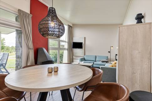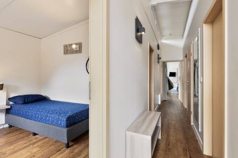 Deze recreatiewoning van het type 6C1 is nabij de centrale faciliteiten gelegen. De woning beschikt over een moderne zit- en eethoek met sfeervolle open haard en flatscreen-tv. De open keuken is voorzien van diverse apparatuur, zoals o.a. een vaatwasser, combimagnetron, koelkast met vriesvak en een Senseo koffiezetapparaat. De woning telt drie slaapkamers, allen voorzien van twee 1-persoons boxsprings. De badkamer is voorzien van een ligbad, douchecabine en wastafel. Het toilet is separaat. Het deels overdekte terras is voorzien van terrasmeubilair. Op het grasveld voor de woning is nagenoeg de gehele dag zon en heeft men uitzicht op het meer.