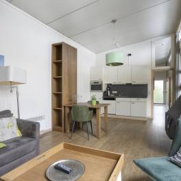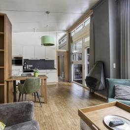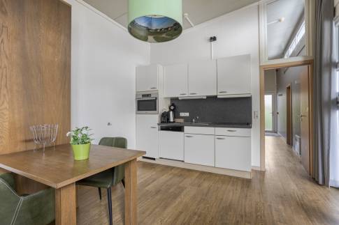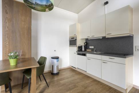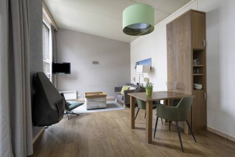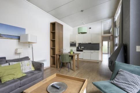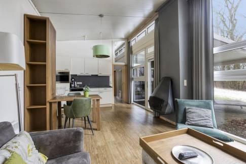 Deze comfortabele 2-persoons hoekwoning, type 2L, is rustig en zonnig gelegen met zicht op het meer. De woning en geheel gelijkvloers en beschikt over een lichte woonkamer met een zit- en eethoek en een sfeervolle open haard. De open keuken is volledig ingericht en voorzien van diverse inbouwapparatuur, waaronder een vaatwasser, elektrische kookplaat, koelkast en combimagnetron.