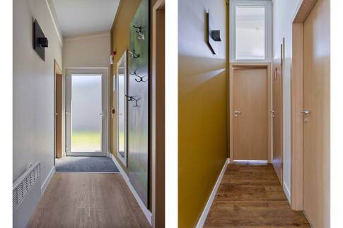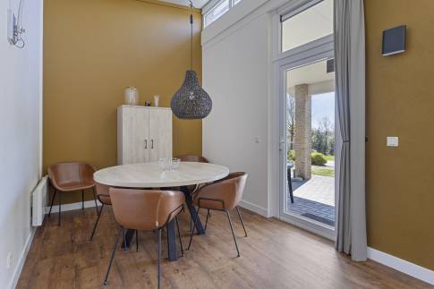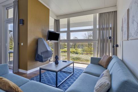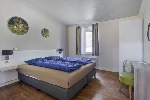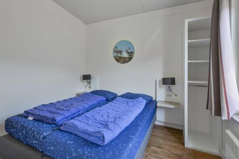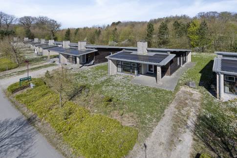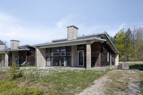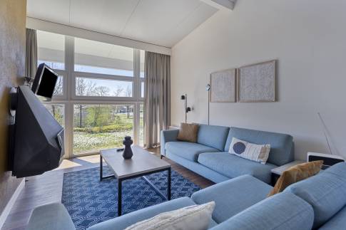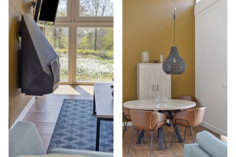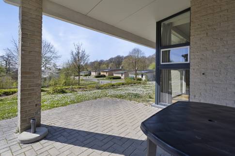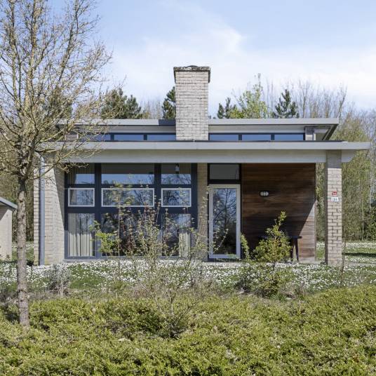 Deze vrijstaande 6-persoonswoning (type 6C2) is zonnig gelegen in de rand van het recreatiepark en biedt een prachtig uitzicht. De sfeervolle woonkamer, met een knusse open haard en eethoek, geeft direct toegang tot het deels overdekte terras, compleet met terrasmeubilair.