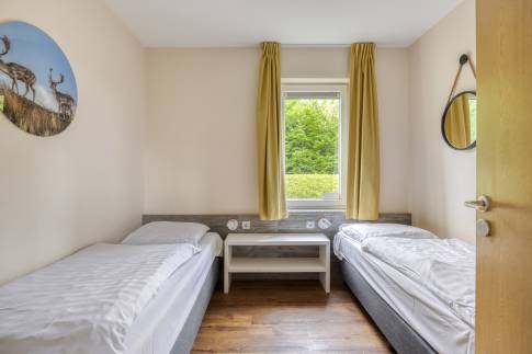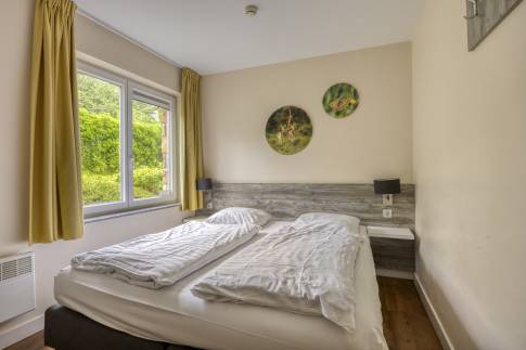 De 2 slaapkamers beschikken beide over twee 1-persoons boxspringbedden. De badkamer is gerenoveerd in 2023 en voorzien van een douche, wastafel en een ligbad. Verder is er een separaat toilet aanwezig en een 2-persoonssauna. Daarnaast is er een inpandige berging met wasmachine- en droger.