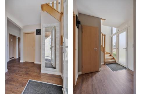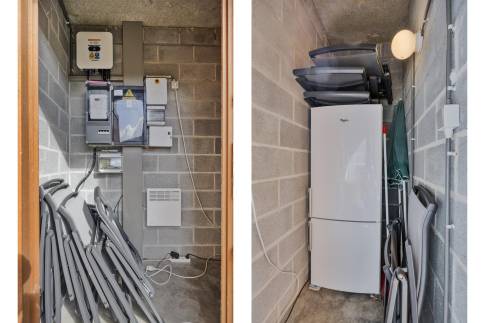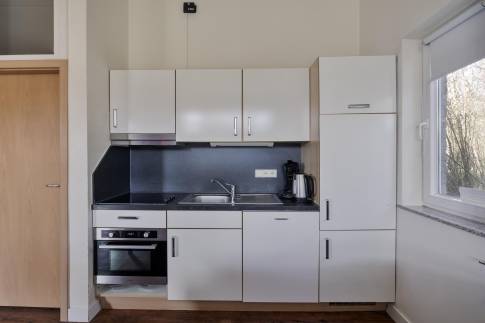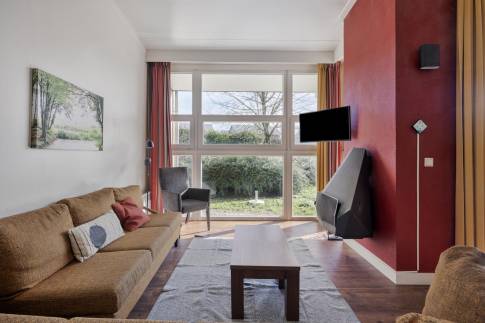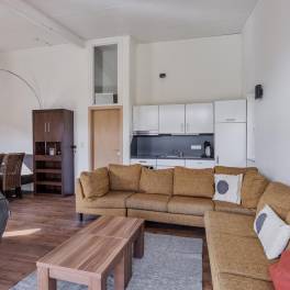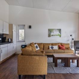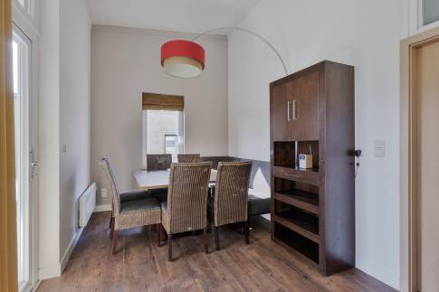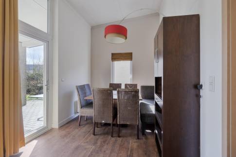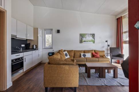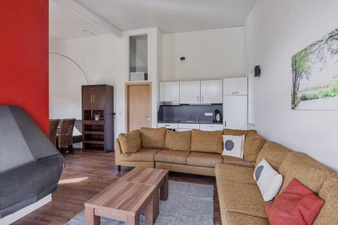 De lichte woonkamer beschikt over een gezellige zit- en eethoek met open haard. De open keuken, met deur naar het gemeubileerde terras, is van alle gemakken voorzien en beschikt over verschillende (inbouw)apparatuur zoals o.a. een vaatwasser, combimagnetron, twee koelkasten met vriesvak, waterkoker, een 4-pits elektrische kookplaat en een Senseo- en filterkoffiezetapparaat.