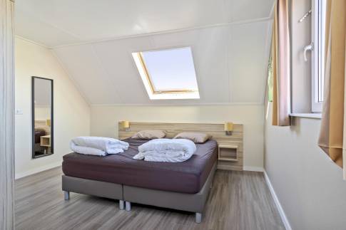 In de recreatiewoning treft u een royale woonkamer met open keuken en toegang tot het terras buiten. Op de begane grond is een royale en lichte slaapkamer met een douche. Op de verdieping zijn twee slaapkamers en een separate badkamer met ligbad toilet en wastafel gesitueerd. De woning beschikt over een inpandige berging.