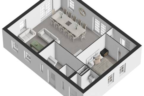 Via de hal bereik je de lichte woonkamer, die aan drie zijden is voorzien van raampartijen en dankzij twee paar openslaande deuren naar het terras een prachtig gevoel van ruimte creëert.