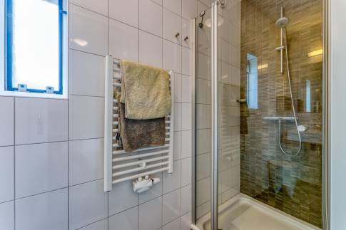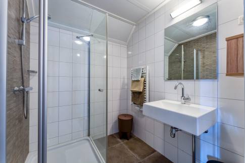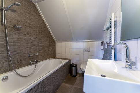 De badkamers zijn afgewerkt met lichte tegels en moderne sanitaire voorzieningen, wat zorgt voor een eigentijdse uitstraling.