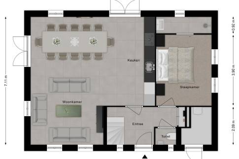 De centrale entree biedt toegang tot de toiletruimte, meterkast en trap naar de eerste verdieping.