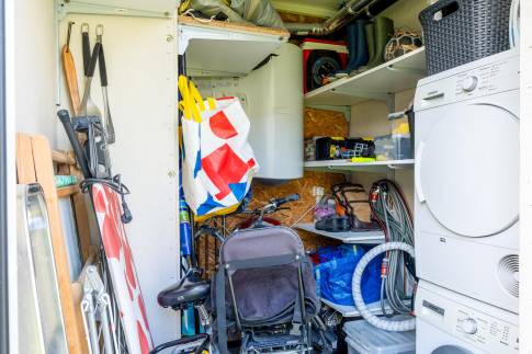 De inpandige berging is praktisch ingedeeld met wasmachine- en drogeraansluiting, cv-installatie en voldoende ruimte voor fietsen en tuinspullen.