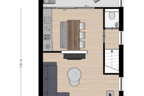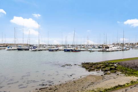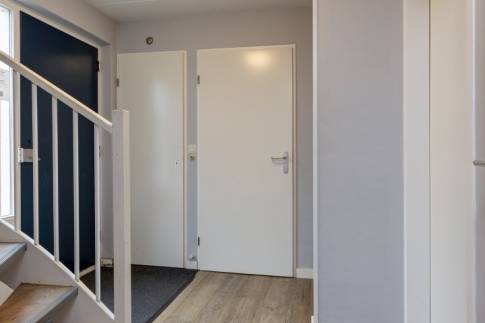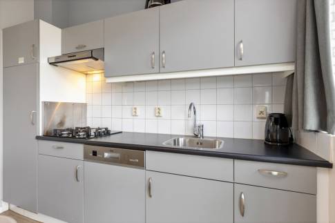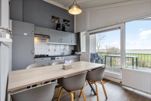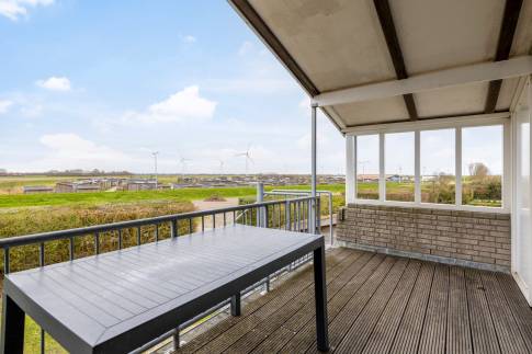 Wanneer je de trap opgegaan bent naar de 1e verdieping, begrijp je direct waarom het woonprogramma boven is. Vanuit de ruime woonkamer kijk je namelijk zo richting de jachthaven. Aan de achterkant van de woning is de half open keuken aanwezig, die direct aan het dakterras grenst. Zo kun je eenvoudig lekker buiten eten, genietend van de Zeeuwse zon. Of van het weidse uitzicht, want de woning bevind zich aan de rand van het park.