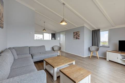 Bij binnenkomst in deze 8 persoons woning merk je direct op dat deze geen standaard indeling heeft. De woning heeft namelijk het woonprogramma op de 1e verdieping. Slapen doe je beneden.