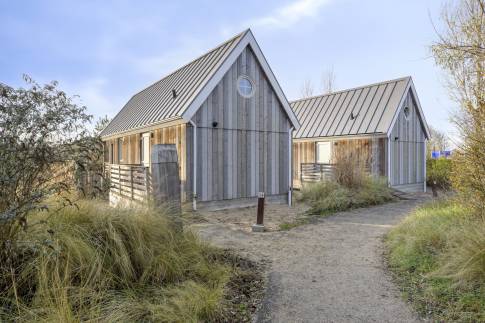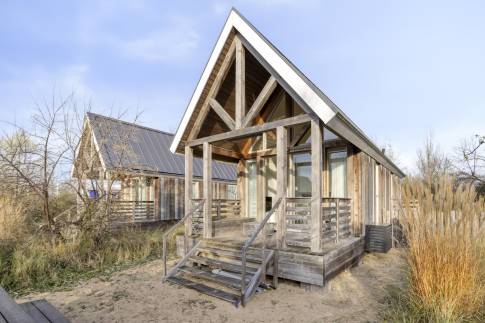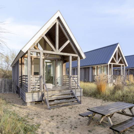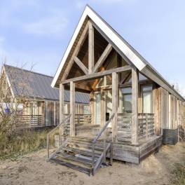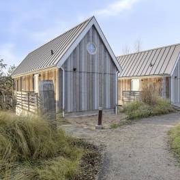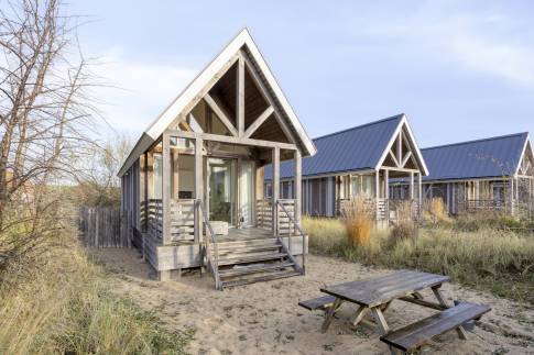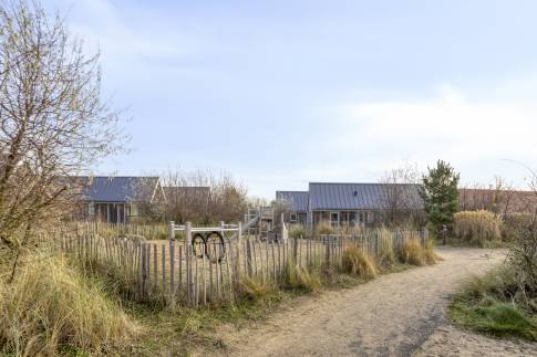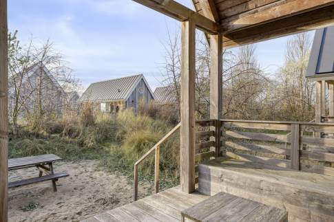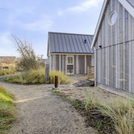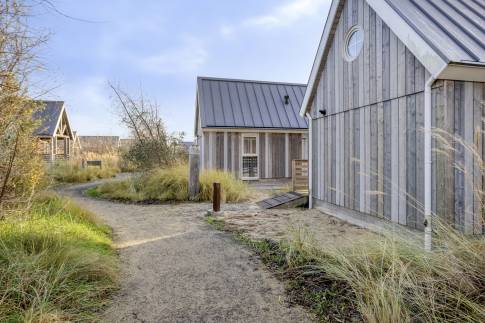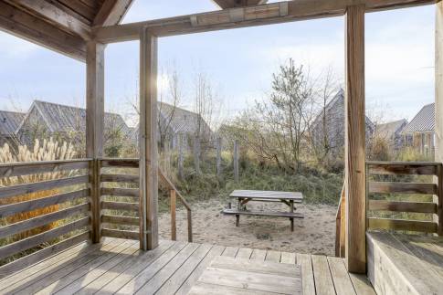Rondom de woning ligt een eigen “zandtuin” met picknicktafel, omgeven door duinbegroeiing zoals helmgras en struiken, wat zorgt voor veel privacy en een authentieke strandsfeer. Het resort beschikt daarnaast over uitgebreide faciliteiten, waaronder een zwemparadijs, restaurant, supermarkt en diverse speelvoorzieningen.