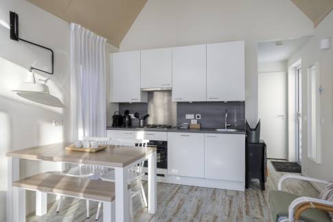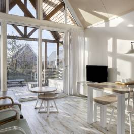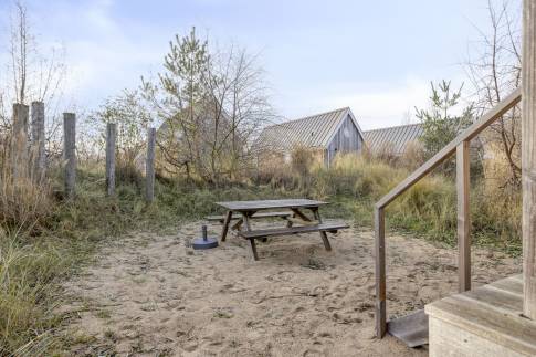 De woning beschikt over een eigen zandtuin met picknicktafel, ideaal voor lange zomeravonden of een ontspannen ontbijt in de zon. Door de ligging en de omliggende duinbeplanting geniet je hier van veel privacy. De veranda biedt beschutting en vormt een verlengstuk van de woonkamer.