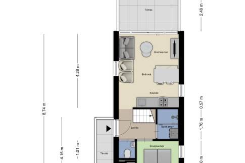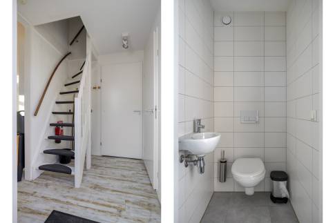 Via de entree met trapopgang zijn alle vertrekken bereikbaar. In de hal bevinden zich tevens het separate toilet en de badkamer.