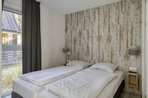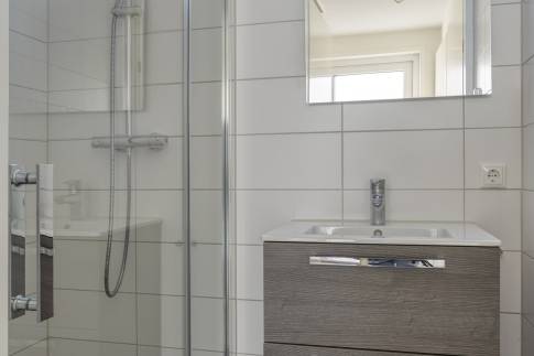 Op de begane grond bevindt zich tevens een comfortabele slaapkamer met tweepersoonsbed. De houtlook accentwand geeft de kamer een warme, rustige uitstraling. De moderne badkamer is uitgerust met een douchecabine en een strak wastafelmeubel.