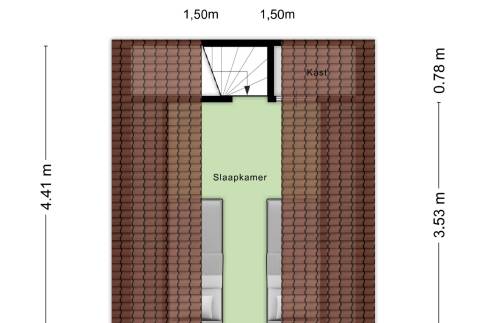 De verdieping bestaat uit een knusse slaapzolder met twee eenpersoonsbedden. Dankzij de stahoogte in het midden is de ruimte prettig bruikbaar. Het karakteristieke ronde raam in de kopgevel zorgt voor extra daglicht en geeft deze verdieping een uniek en charmant karakter. Daarnaast is er praktische bergruimte aanwezig.