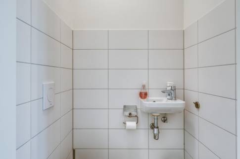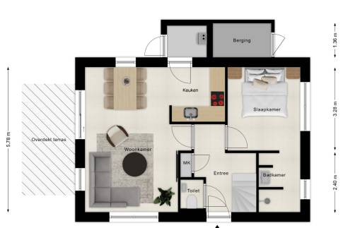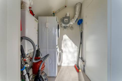 De open keuken sluit perfect aan op de woonkamer en is praktisch ingericht, waardoor koken en samenzijn vanzelfsprekend samengaan. Aangrenzend bevindt zich een berging/bijkeuken, ideaal voor extra opslag en het netjes uit het zicht plaatsen van installaties en witgoedaansluitingen.