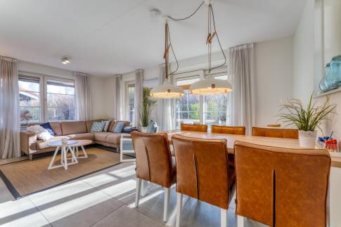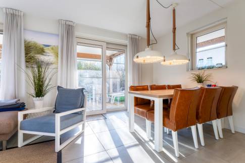 De woning is licht, ruim en prettig ingedeeld. Grote raampartijen zorgen voor een mooie natuurlijke lichtinval en versterken het open karakter van de leefruimte. Via de schuifpui stap je direct het overdekte terras op, waar binnen en buiten naadloos in elkaar overlopen. Een heerlijke plek om in alle seizoenen te genieten — van lange zomeravonden tot beschutte momenten in het voor- en najaar.