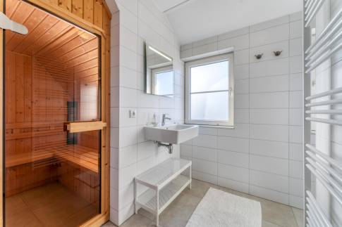 Op de eerste verdieping bevinden zich nog twee comfortabele slaapkamers, een moderne tweede badkamer en een separaat toilet. De sauna op deze verdieping vormt een duidelijke meerwaarde: na een dag aan zee of een lange fietstocht kom je hier volledig tot rust.