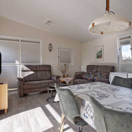 De woonkamer voelt heerlijk licht en ruim dankzij de grote raampartijen en de harmonieuze kleuren. De foto’s laten zien hoe het daglicht mooi binnenvalt en hoe de ruimte is ingedeeld met een comfortabele zithoek. De jaloezieën zorgen voor privacy zonder het licht te verliezen. De woonkamer staat in open verbinding met de keuken, ideaal voor gezellig samen zijn.
