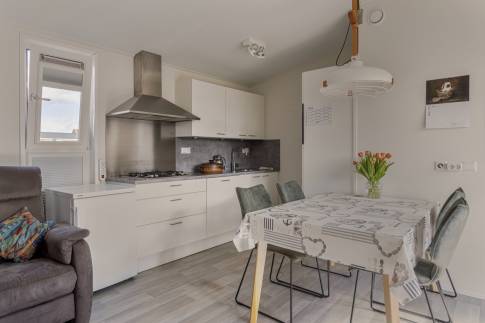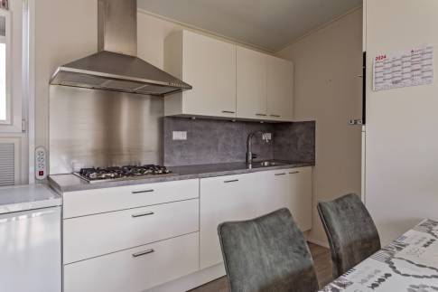 De moderne keuken is uitgevoerd in wit en grijstinten en beschikt over veel kastruimte, een strak composiet-look blad en een grote rvs-wandbekleding achter de kookplaat. Hier kook je met plezier terwijl je in contact blijft met de rest van het gezelschap. De keuken is compleet uitgerust met o.a. een rvs-afzuigkap, gaskookplaat en geïntegreerde apparatuur.