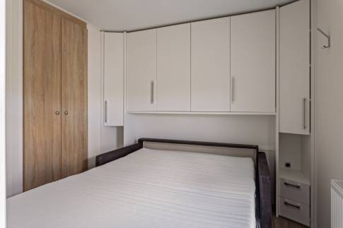 De master bedroom heeft directe toegang tot de badkamer en suite, en beschikt over veel opbergruimte boven en naast het bed.