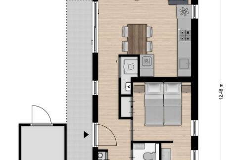 Je stapt binnen in een lichte hal met moderne houtaccenten en voldoende opbergruimte. De afwerking is strak en verzorgd, met een fraaie laminaatvloer die door de hele woning is doorgelegd — dit zorgt voor een rustige en uniforme uitstraling. Vanuit de hal bereik je de slaapkamers, de woonkamer, het separate toilet en de berging.