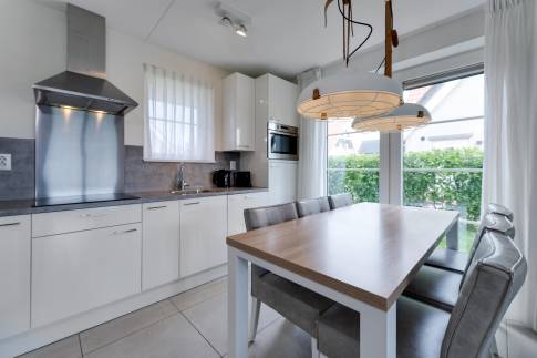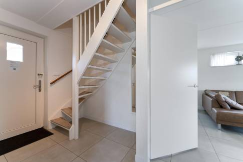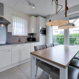 Via de entree betreed je de ruime hal, die toegang biedt tot de trapopgang naar de verdieping, het separate toilet, de meterkast, een handige bijkeuken, de eerste slaapkamer en de lichte, sfeervolle woonkamer. De woonkamer voelt ruim aan dankzij de grote raampartijen en de schuifpui naar het overdekte terras, waardoor binnen en buiten naadloos in elkaar overgaan. Hier geniet je het hele jaar door van een heerlijk gevoel van ruimte en licht. De open keuken sluit perfect aan op de woonkamer en is modern ingericht met strakke fronten, een fraai werkblad en compleet uitgerust met alle benodigde, volledig geïntegreerde inbouwapparatuur – ideaal voor wie graag kookt of gasten ontvangt.