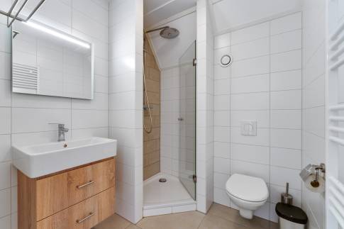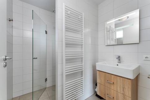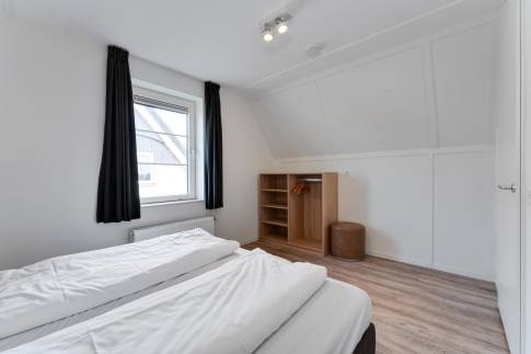 De slaapkamer op de begane grond biedt veel comfort en is voorzien van een eigen badkamer en suite. Deze is stijlvol afgewerkt en beschikt over een ruime inloopdouche, een wastafelmeubel en een design handdoekradiator. Perfect als je gelijkvloers wilt slapen of gasten een fijne privéruimte wilt bieden. In de bijkeuken vind je de aansluiting voor de wasmachine en droger, met daarnaast voldoende opbergruimte voor proviand, jassen of strandspullen. Deze indeling maakt de woning niet alleen praktisch, maar ook comfortabel en toekomstbestendig.