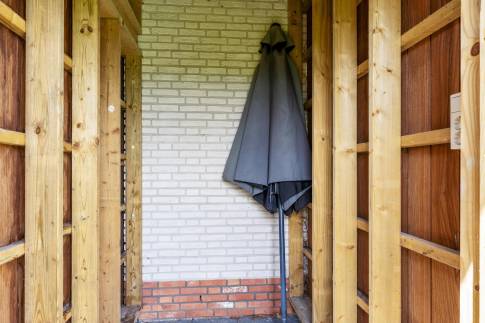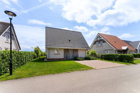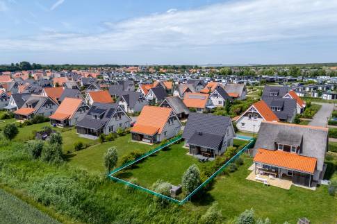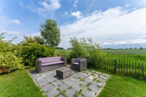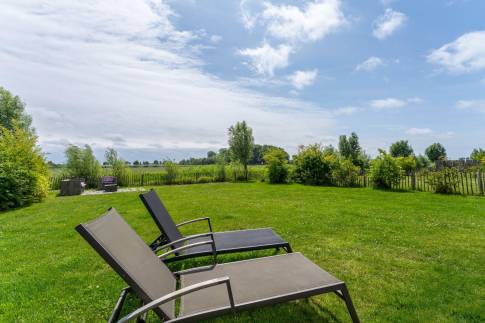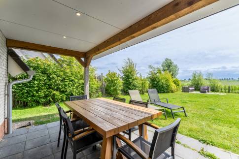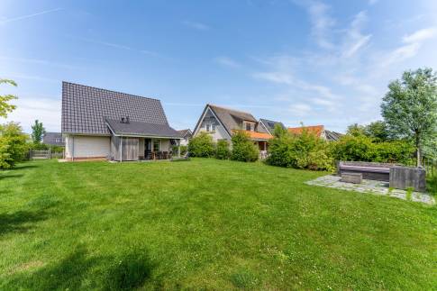 Rondom de woning ligt een keurig onderhouden, met gras ingezaaide tuin met een heerlijke zuidligging, waardoor je hier vrijwel de hele dag van de zon kunt genieten. Het vrije uitzicht over de omliggende polder geeft een extra gevoel van ruimte en rust – een prachtig decor om elke dag van te genieten. Direct aan de woning bevindt zich een ruim terras met een stijlvolle overkapping, perfect om ook tijdens koelere avonden of bij een zomerse bui comfortabel buiten te zitten. Aangrenzend is een praktische berging aangebouwd, ideaal voor het opbergen van fietsen, tuingereedschap of strandspullen. Een fijne buitenruimte waar het ultieme vakantiegevoel vanzelf ontstaat.