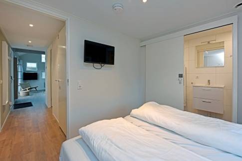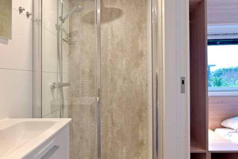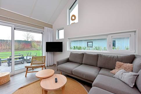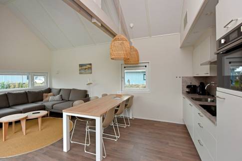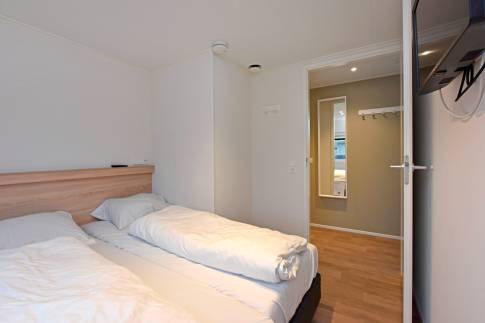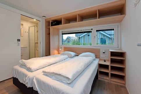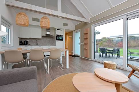 Via de entree kom je direct in de woonkamer met zithoek en de open keuken. De woonkamer is bijzonder licht en ruimtelijk door de vele en grote raampartijen in combinatie met het hoge plafond. Middels een schuifpui kan je naar het aangrenzende ruime terras. De moderne keuken is voorzien van alle benodigdheden zoals een 4-pits gaskookplaat, afzuigkap, spoelbak, combimagnetron, koelkast inclusief vriesvak en een vaatwasmachine. In de lodge zijn 3 slaapkamers aanwezig. De ouderslaapkamer beschikt over een badkamer en suite. Deze is uitgerust met een inloopdouche, een wastafel, een toilet en een designradiator. De tweede en derde slaapkamers hebben beide 2 aparte bedden en zijn voorzien van handige kasten. De tweede badkamer is te bereiken vanuit de hal en heeft een douche en een wastafel. De hal geeft ook toegang tot een apart toilet met fonteintje en een bergkast met de witgoedaansluitingen.