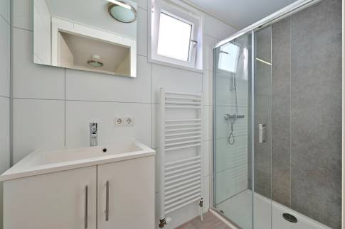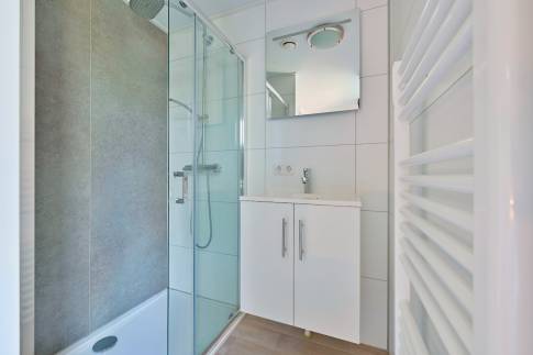 Via een hal komen we bij drie ruime slaapkamers, waarvan één slaapkamer beschikt over een en-suite badkamer met een inloopdouche en wastafel met meubel. De tweede badkamer, bereikbaar vanuit de hal, is eveneens voorzien van een inloopdouche en wastafel met meubel. Een vlizotrap in de hal leidt naar een ruime, afgesloten zolder waar privéspullen kunnen worden opgeborgen. Een apart toilet en een bergkast voor de wasmachine maken het geheel compleet.