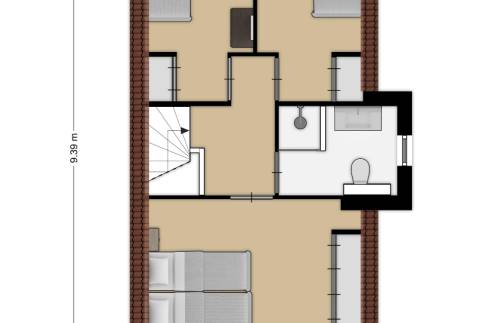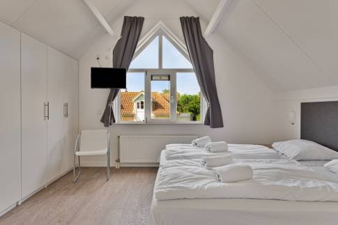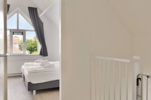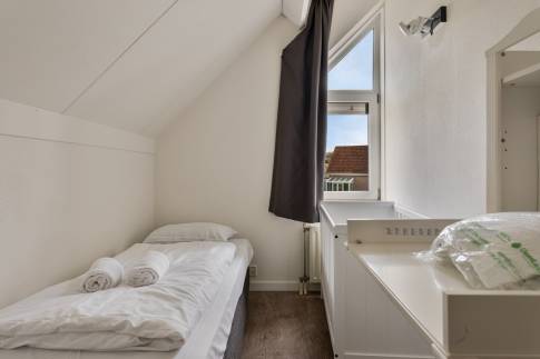 Op de 1e verdieping zijn een badkamer en 3 slaapkamers aanwezig. Op 1 slaapkamer vind je twee eenpersoonsbedden, de andere twee slaapkamers zijn voorzien van 1 bed. Ook staat er in één van de slaapkamers een commode en kinderledikant.