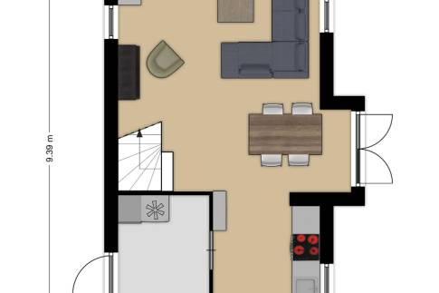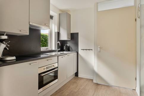 Op de begane grond vind je de woonkamer met open keuken. Een van de pluspunten van de woning is de vele ramen, waardoor je veel lichtinval hebt. Zo heb je bijvoorbeeld ook openslaande tuindeuren in de woonkamer. Op de begane grond zijn tevens een inpandige berging en de hal met apart toilet en toegang tot boven aanwezig.