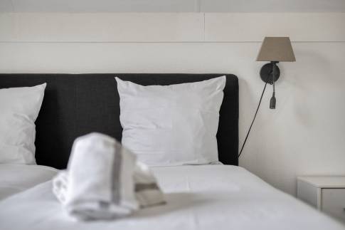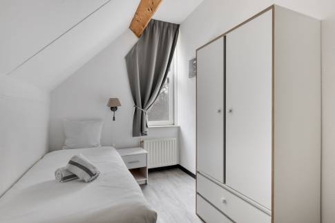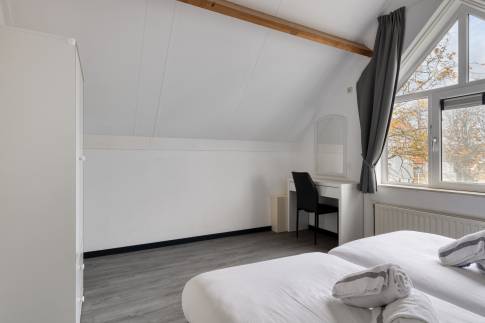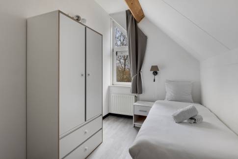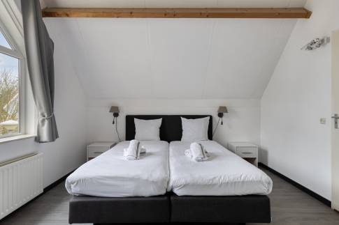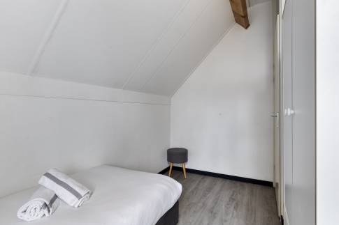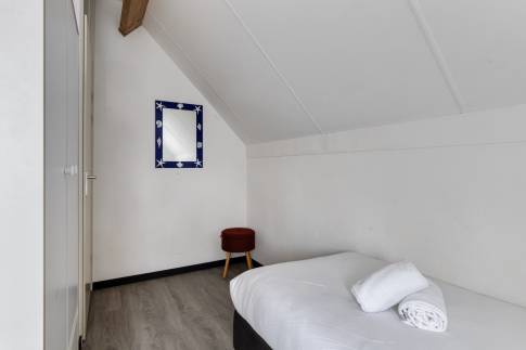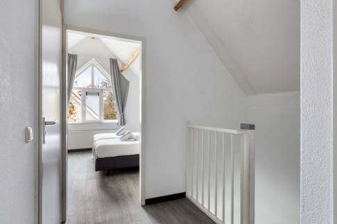 Op de verdieping bevinden zich drie slaapkamers, waaronder één slaapkamer met twee eenpersoons boxspringbedden en twee slaapkamers met elk één eenpersoons boxspringbed. De badkamer is eveneens op de verdieping gesitueerd en beschikt over een douche en een toilet. Daarnaast is er een separaat toilet op de begane grond. Extra praktisch is de aanwezige ruime berging.