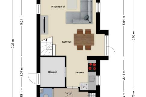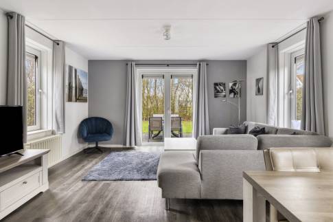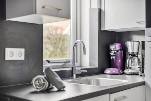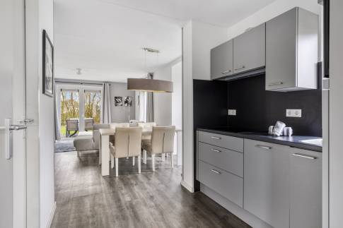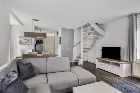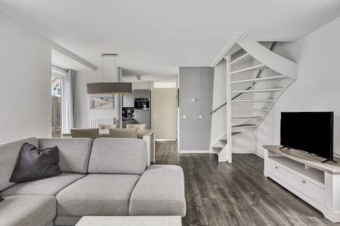 De sfeervolle woonkamer is ingericht met een comfortabele zithoek en een aparte eethoek. Aansluitend bevindt zich de complete keuken, die is voorzien van alle gemakken zoals een vaatwasser, combimagnetron, kokendwaterkraan, koelkast met vriesvak, waterkoker en een koffiepadapparaat (Senseo).