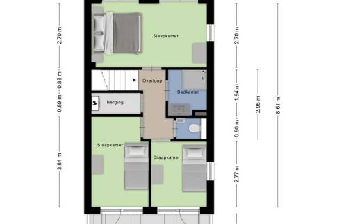 Op de bovenverdieping bevinden zich drie comfortabele slaapkamers: één met een tweepersoons boxspring en twee met eenpersoons boxspringbedden. Alle slaapkamers hebben openslaande deuren naar een aangrenzende veranda, waardoor je ook hier volop kunt genieten van licht en buitenruimte. De moderne badkamer is voorzien van een inloopdouche, wastafelmeubel en toilet, en combineert stijl met functionaliteit.