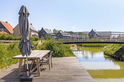 De openslaande deuren geven toegang tot de achtertuin, die voornamelijk bestaat uit een riant vlonderterras aan het water.