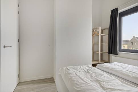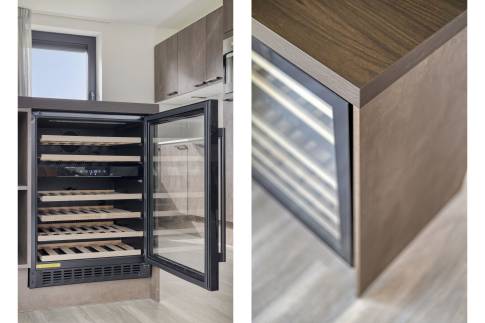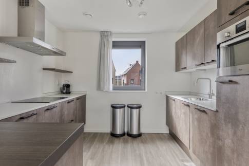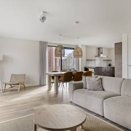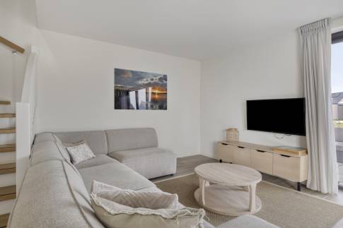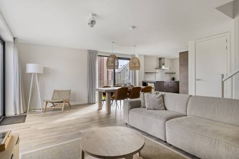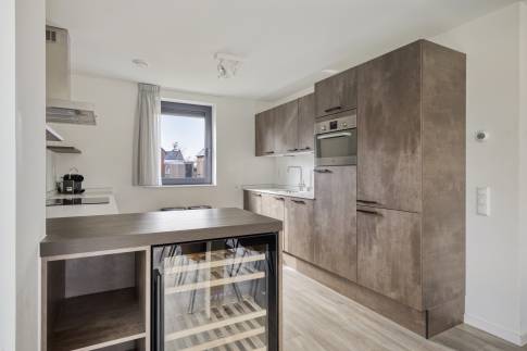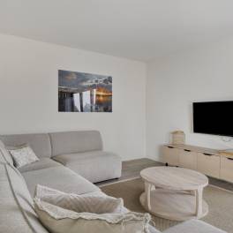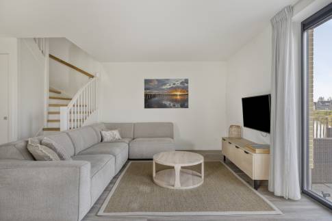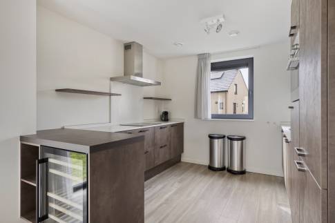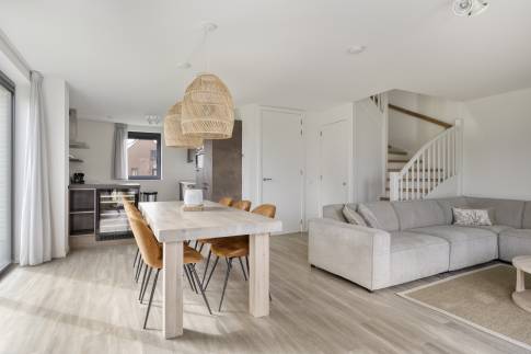 Via de hal betreed je de lichte woonkamer met open keuken. De woonkamer is voorzien van vloerverwarming en ingericht met een gezellige zithoek met televisie en een eethoek. De open keuken is compleet uitgerust met onder andere een Nespresso koffiemachine, waterkoker, koelkast met vriesvak, combimagnetron, vaatwasser en een wijnklimaatkast.