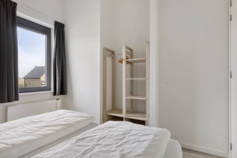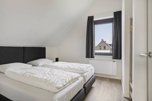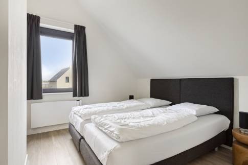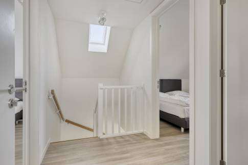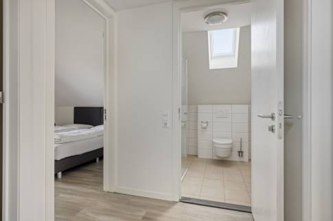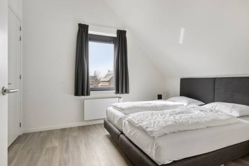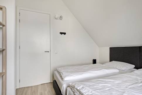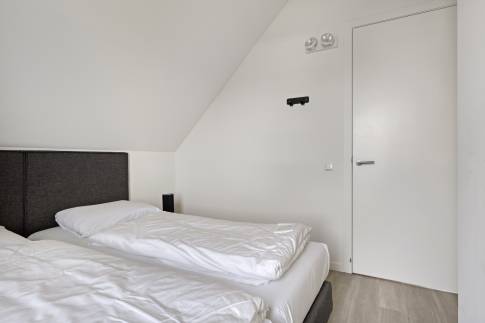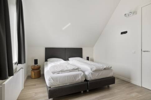 Op de eerste verdieping bevinden zich drie slaapkamers, elk ingericht met twee eenpersoons boxspringbedden. Eén slaapkamer beschikt over een badkamer en suite met douche en wastafel. De tweede badkamer is bereikbaar vanaf de overloop en is voorzien van een douche, wastafel, toilet en sauna – ideaal voor extra ontspanning. Op de begane grond is daarnaast een separaat toilet aanwezig.