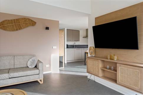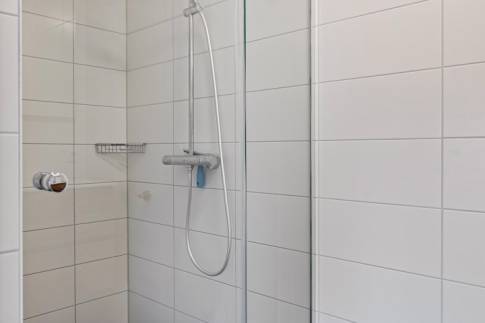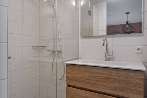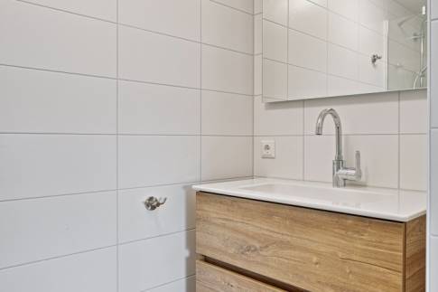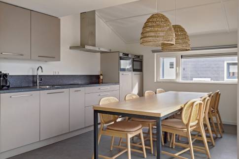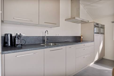 De keuken met keukenblok in rechte opstelling is uitgerust met een spoelbak, vaatwasser, inductiekookplaat, combimagnetron, afzuigkap en koelkast met vriesvak. Ook biedt de moderne keuken voldoende opbergmogelijkheden. De keuken is ruim genoeg voor een grote, gezellige eethoek waar je heerlijk met vrienden en/of familie kunt borrelen.