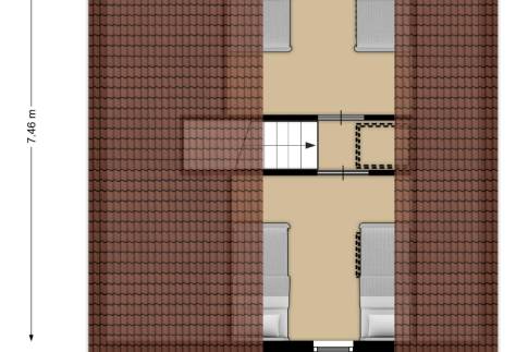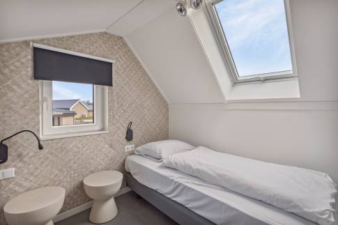 Wanneer we de trapopgang nemen komen we op de overloop. Deze geeft toegang tot de 2 andere slaapkamers. Deze zijn beide voorzien van een dakraam. De schuine daken zorgen voor een knus gevoel in de ruimtes.