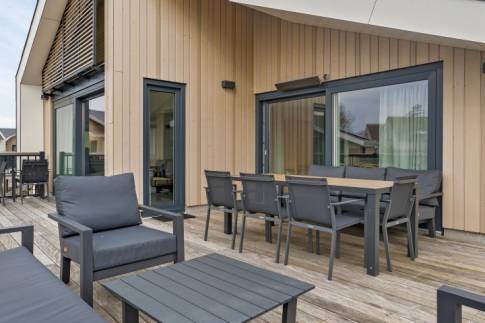Over de gehele breedte van de woning grenst het vlonderterras. Hier is ruimte voor verschillende zitjes. Een gedeelte van het terras is overkapt waardoor je ook heerlijk in de schaduw kan vertoeven.