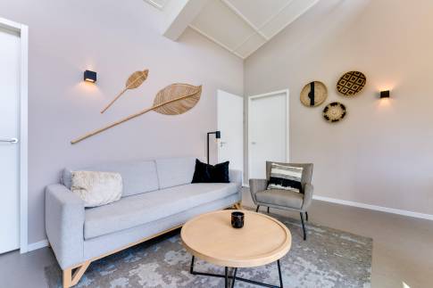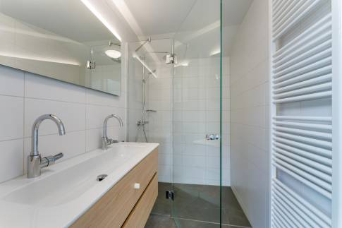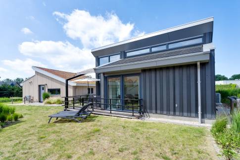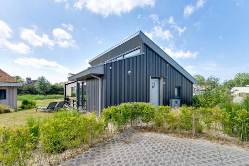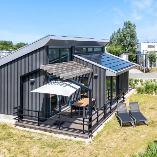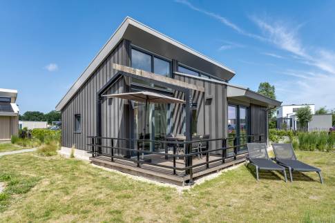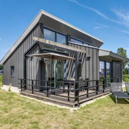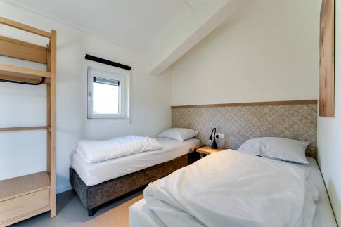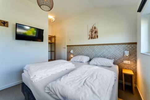 De bungalow beschikt over twee slaapkamers en een moderne badkamer. Deze is ingericht met een inloopdouche voorzien van een regendouche, een stijlvolle wastafel en een handdoekradiator. Een apart toilet maakt het geheel compleet.