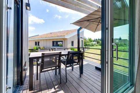 Dankzij de grote raampartijen is de overgang van keuken naar de lichte woonkamer naadloos en natuurlijk. Zet je de tuindeuren open, dan vloeien binnen en buiten moeiteloos in elkaar over, wat de leefruimte nog ruimer laat aanvoelen. Bovendien geniet je hier van vrij uitzicht en een fijne lichtinval.