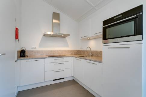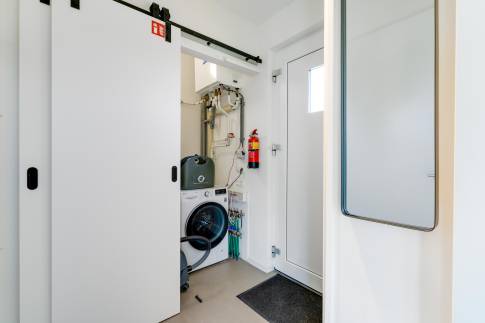 Deze gelijkvloerse bungalow is volledig voorzien van comfortabele vloerverwarming. Via de centraal geplaatste voordeur stap je binnen in de hal. Direct rechts vind je een handige stookruimte, netjes weggewerkt achter schuifdeuren. Loop je door, dan kom je in de moderne halfopen keuken, uitgerust met geïntegreerde inbouwapparatuur die van alle gemakken voorziet.