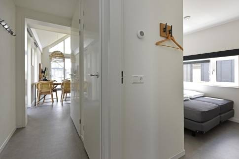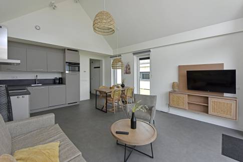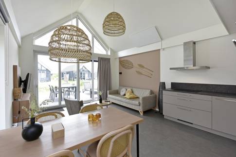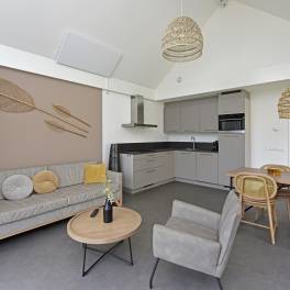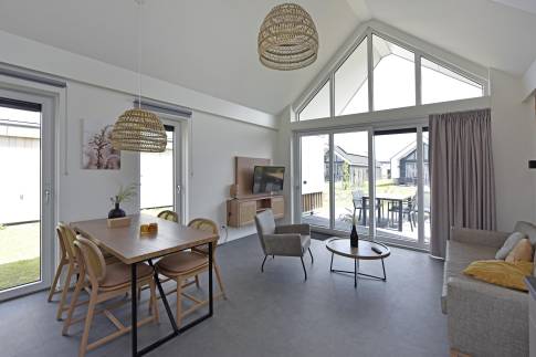 Bij binnenkomst word je verwelkomd in een nette hal die toegang biedt tot alle vertrekken. Zodra je doorloopt naar de woonkamer, valt meteen de ruimte en stijlvolle inrichting op. De gezellige zithoek en moderne meubels creëren een warme, uitnodigende sfeer – ideaal om tot rust te komen na een dag aan zee. Dankzij de grote raampartijen baadt de woonkamer in natuurlijk licht en heb je voortdurend zicht op het groene buitenleven.